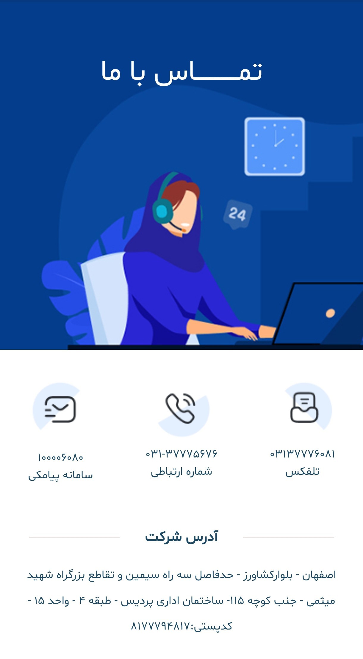نشانی دفتر شرکت: اصفهان، بلوار کشاورز، حد فاصل سه راه سیمین و تقاطع بزرگراه شهید میثمی، جنب کوچه ۱۱۵، ساختمان اداری پردیس، طبقه چهارم، واحد ۱۵