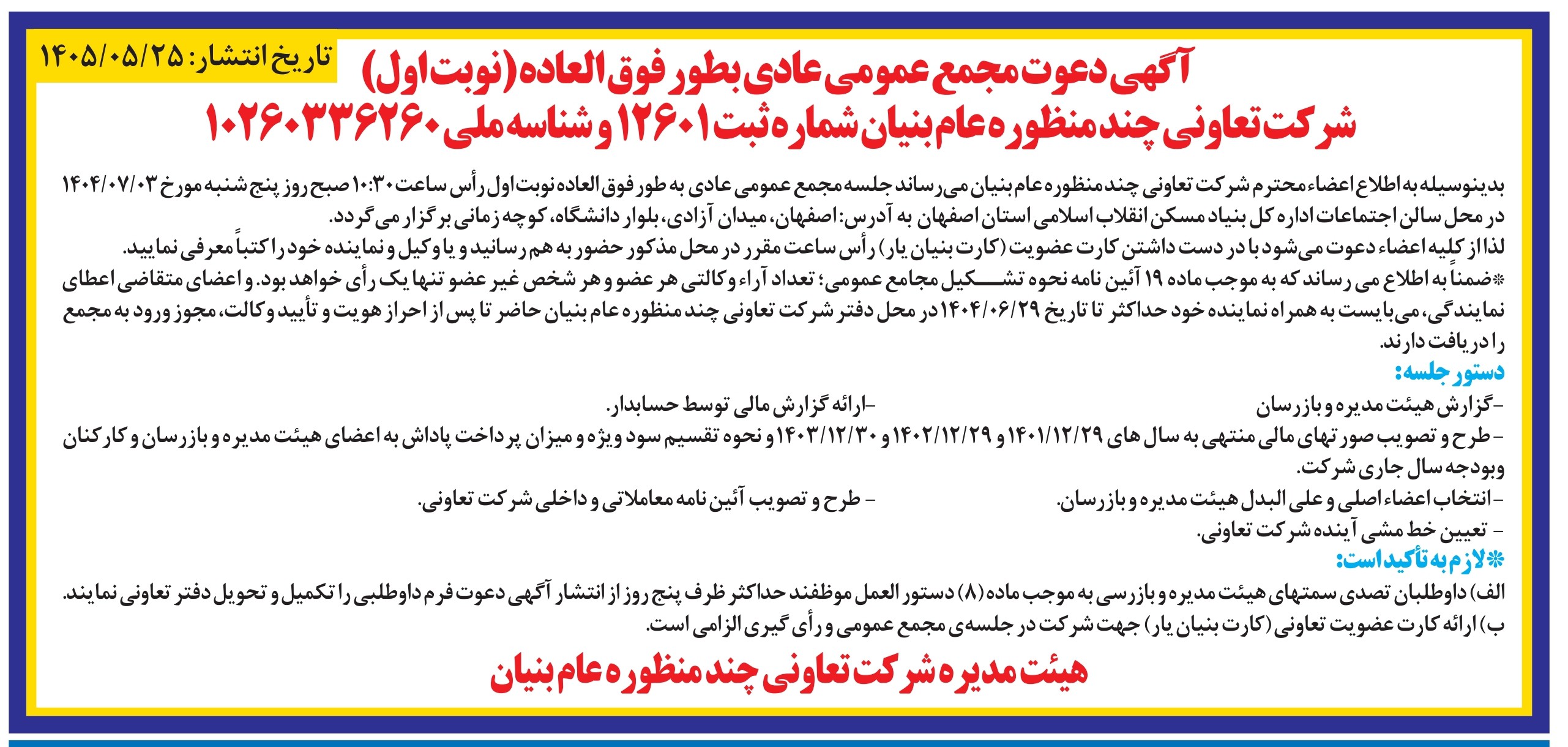 بدینوسیله به اطلاع اعضاء محترم شرکت تعاونی چند منظوره عام بنیان میرساند جلسه مجمع عمومي عادي به طور فوق العاده نوبت اول رأس ساعت 10:30 صبح روز پنجشنبه مورخ 1404/07/03 در محل سالن اجتماعات اداره کل بنیاد مسکن انقلاب اسلامی استان اصفهان به آدرس: اصفهان، میدان آزادی، بلوار دانشگاه، کوچه زمانی برگزار ميگردد