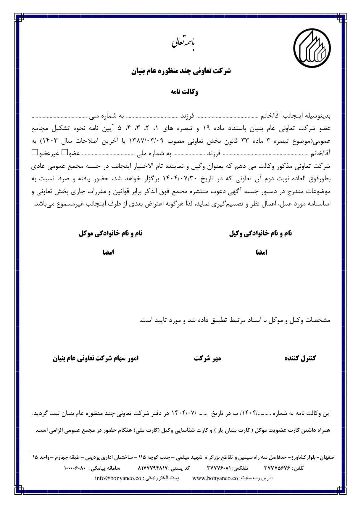 شماره بنیان یار جهت ارسال وکالت نامه و ارتباط با امور سهام: